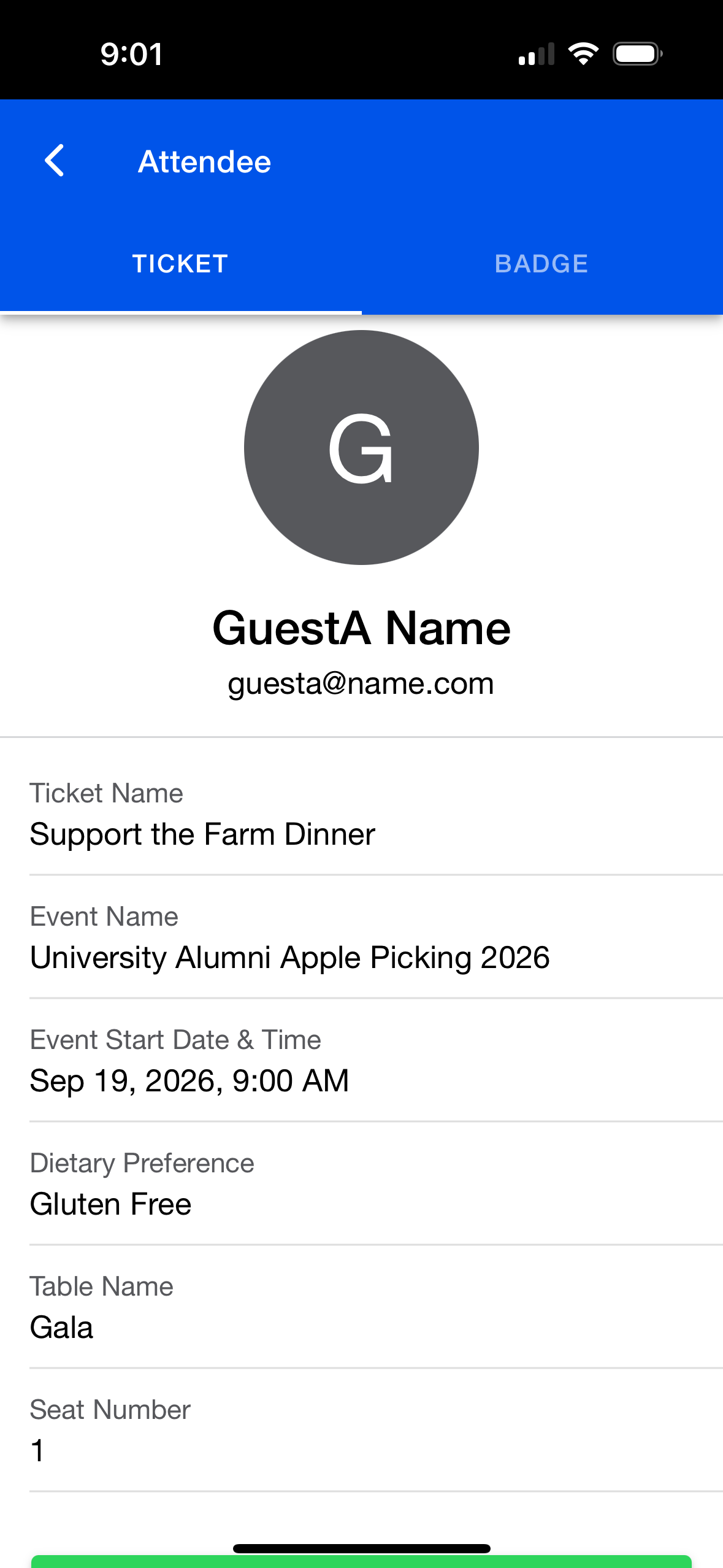 The Attendee Details screen provides basic information about an Attendee, including custom fields such as Dietary Preference and Table Number.