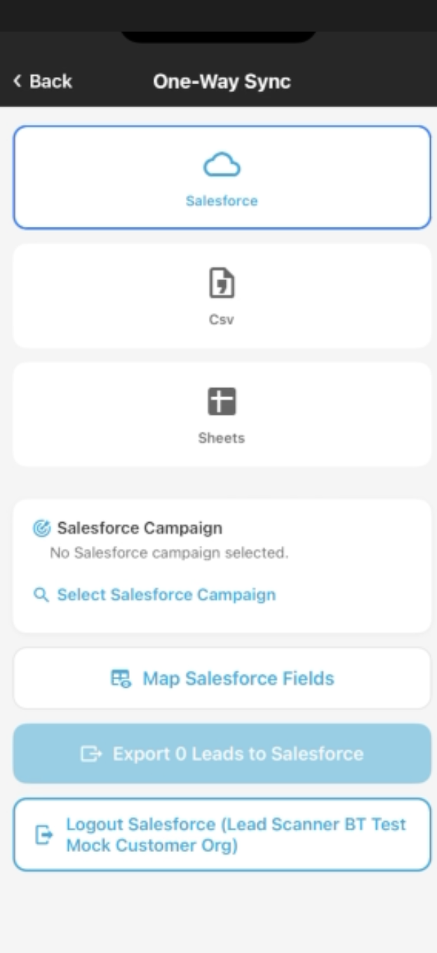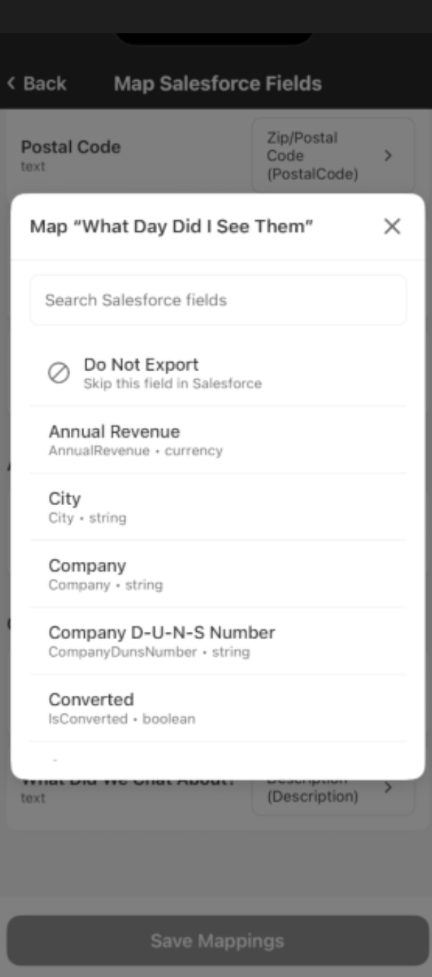 Now you can either tap the Export [X] Leads to Salesforce button to export leads or click Map Salesforce Fields to map fields to Salesforce.