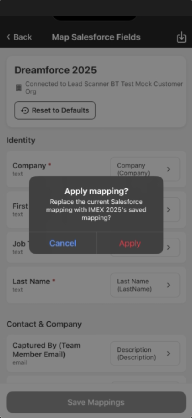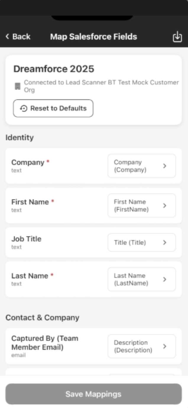 You can now map leads’ fields from the Smart Capture app to the Salesforce Lead records’ fields. By default, fields in the Smart Capture app that lack a standard Salesforce field to map to are mapped to the Description field.