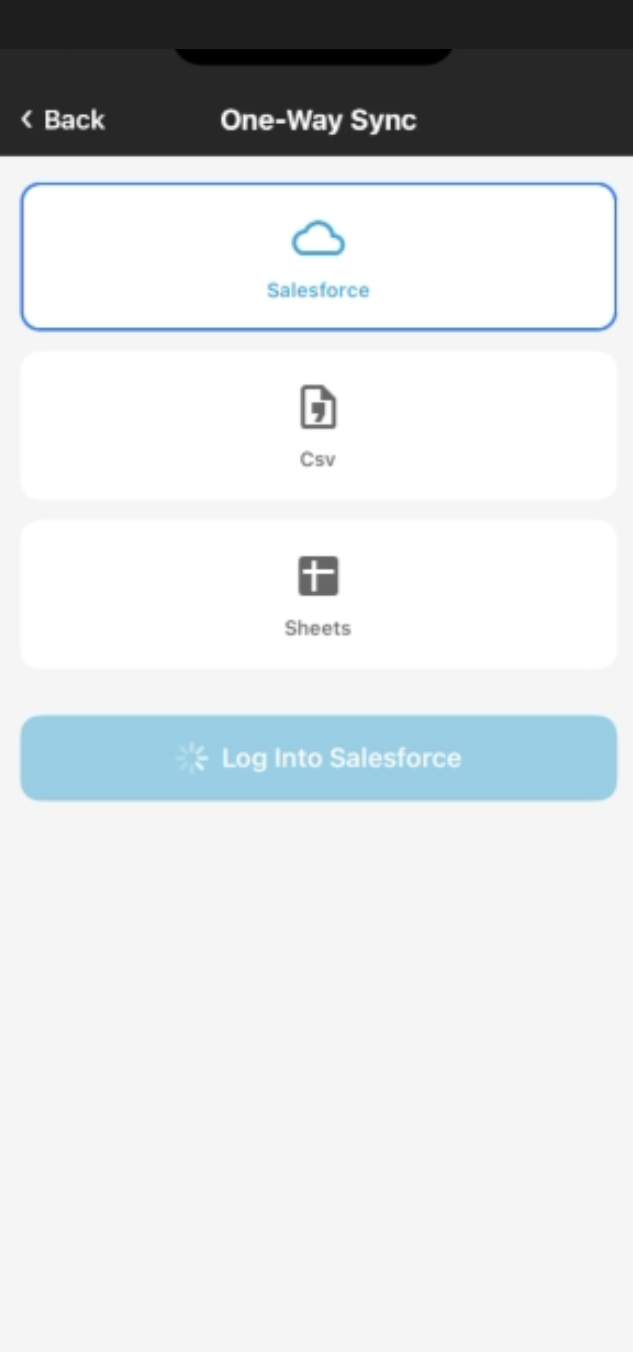 Select Salesforce, CSV, or Sheets. Use the steps below to complete each process.