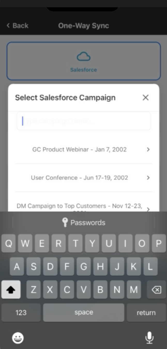 Enter the Salesforce Campaign’s Campaign Name (a partial name is okay) and select it.