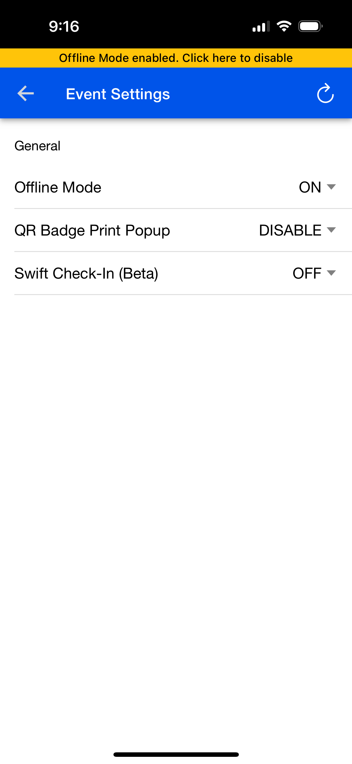 Access the Mobile Check-in app's Offline Mode setting from the new Settings page.